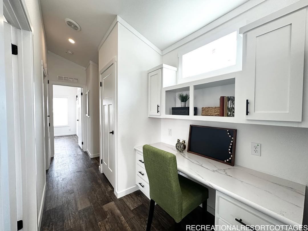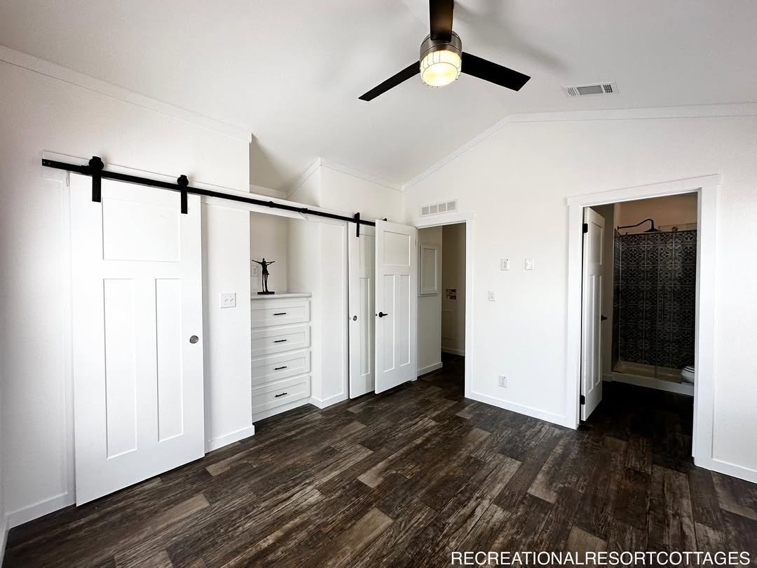 “Dillon” 2 bed/1 bath 819 sq foot single section not only does it come with everything you need for comfortable living, but some awesome pizzazz to go with it. And the best part – you get a floating entertainment center, clerestory windows, a covered front porch, a metal roof, a gorgeous tile shower with rolling barn doors, and so much more! rbi36207