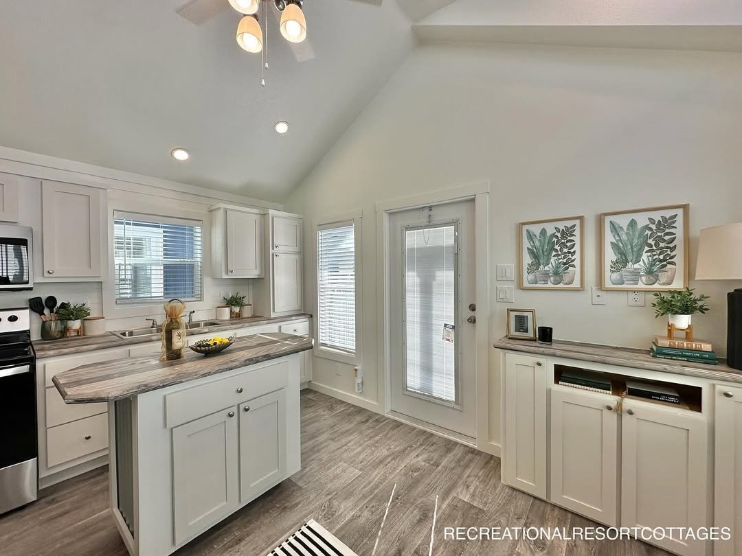 This cabin has cedar accents on the porch and facia, black windows, and the black metal roof. Inside you have the combination of full SYP stained hickory with our grey stained trim and gorgeous hickory cabinets. The island and all appliances come with this tiny home.